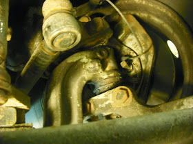 Naturally a lot of emphasis goes on the steering and its components. Checks are made for excess play and anything else that could affect it. Brake shoes can be observed and felt for wear, whilst keeping alert to any leaks or frayed cables etc. the next pic is a little blurred but I'm putting it up anyway as you just don't get a view like this everyday.